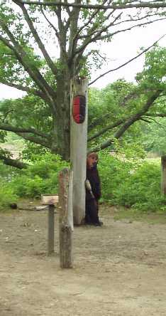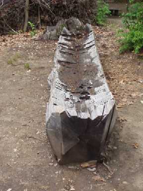 The middle row of pictures show some of the other things that interested me. First is a log canoe under construction, you can see where they have been hollowing it out. Second picture depicts the 'Woodland Spirit' with its black and red parti-colored face, while the third shows skins hung up to cure. |