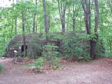 shows a 'starter' hut made from squares of tree bark supported