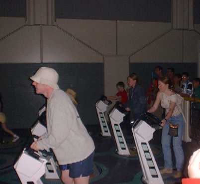 One of our favourite rides in Star Tours. It is a simulated ride to one of the moons on Endor, where the shuttle gets involved in the battle to destroy the Death Star. Its great! At the end of the ride there are a set of games you can go on, they range from computer delivered personality tests to one where you can morph pictures of yourself. In the last picture all 4 kids are on the space scooters. Ian was really proud because he won that game, he is at the very back on the right.