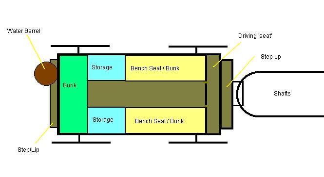 The basic wagon is 12 feet long a about 6 feet wide, it has a small step at the front and then a long 'bench' that covers the whole width of the van, where the driver and his companions sit. They lean up against the front of the van, which is made of wood panelling and has a door that leads into the van itself. The rear wall of the van is also mad of wood panes and there are big supports in each corner which support a wooden roof. The sides are half wood, but the upper half is just canvas stretched down tight, so that on fine days the travellers can open the sides and enjoy the breeze.