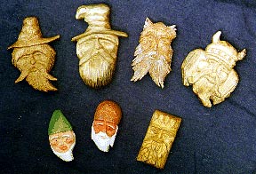The faces are more complex, and require more fine carving - so he generally asks a little more for them. He leaves a small loop on the back of each face so they can be fixed to things quite easily. It is possible to sew them to clothing or to get a smith to attach them to a pin, to make a simple brooch. A perfect present for the wife, girl friend, mother, lover ....