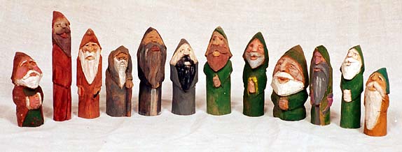 These are examples of Inky's work - The dolls are simple and there are no moving parts. Most adult figures are shown with beards, some will have a sword and a helmet (to represent a warrior) others might wear robes like in these examples, and carry a staff to represent a wizard. Others are clean shaven and perhaps represent babies or smaller children.