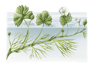 Crowfoot, generally forms a floating bed of green leaves on the surface of the water, obscuring the water below and reducing surface travel to 1/3 of their normal speed. A few stalks reach from the weed mat down to the bottom and under water swimmers are reduced to 2/3 of their normal speed when swimming under crowfoot. A member of the butter cup family crowfoot produces a masses of small yellow or white flowers in summer. They poke their head 2-3 inches out of the water giving the weed carpet a pretty appearance.